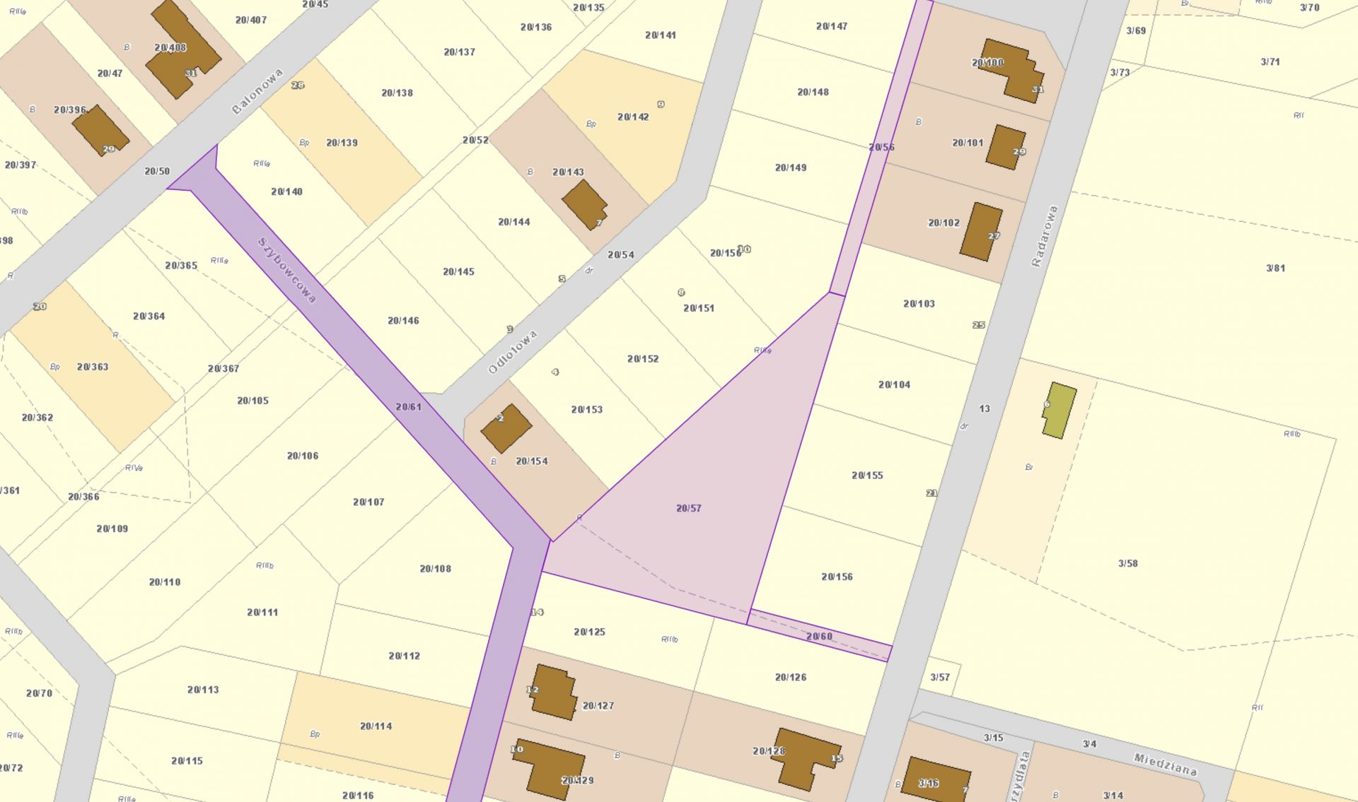 numer 20/57 3698 m2 przeznaczenie 12.3 ZP czyli tereny zieleni urządzonej o charakterze parkowym